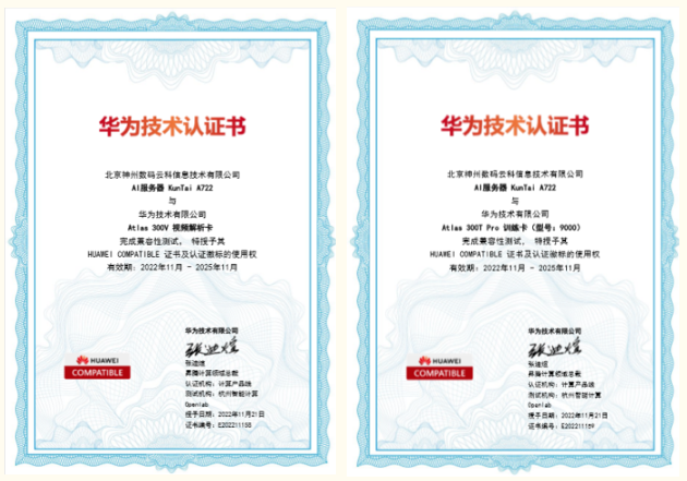 近期,创富国际CFD 创富KunTai A722服务器顺利获得华为“Atlas 300V 视频解析卡”以及“Atlas 300T Pro 训练卡(型号:9000)”两项技术认证,为智能算力再添新力!