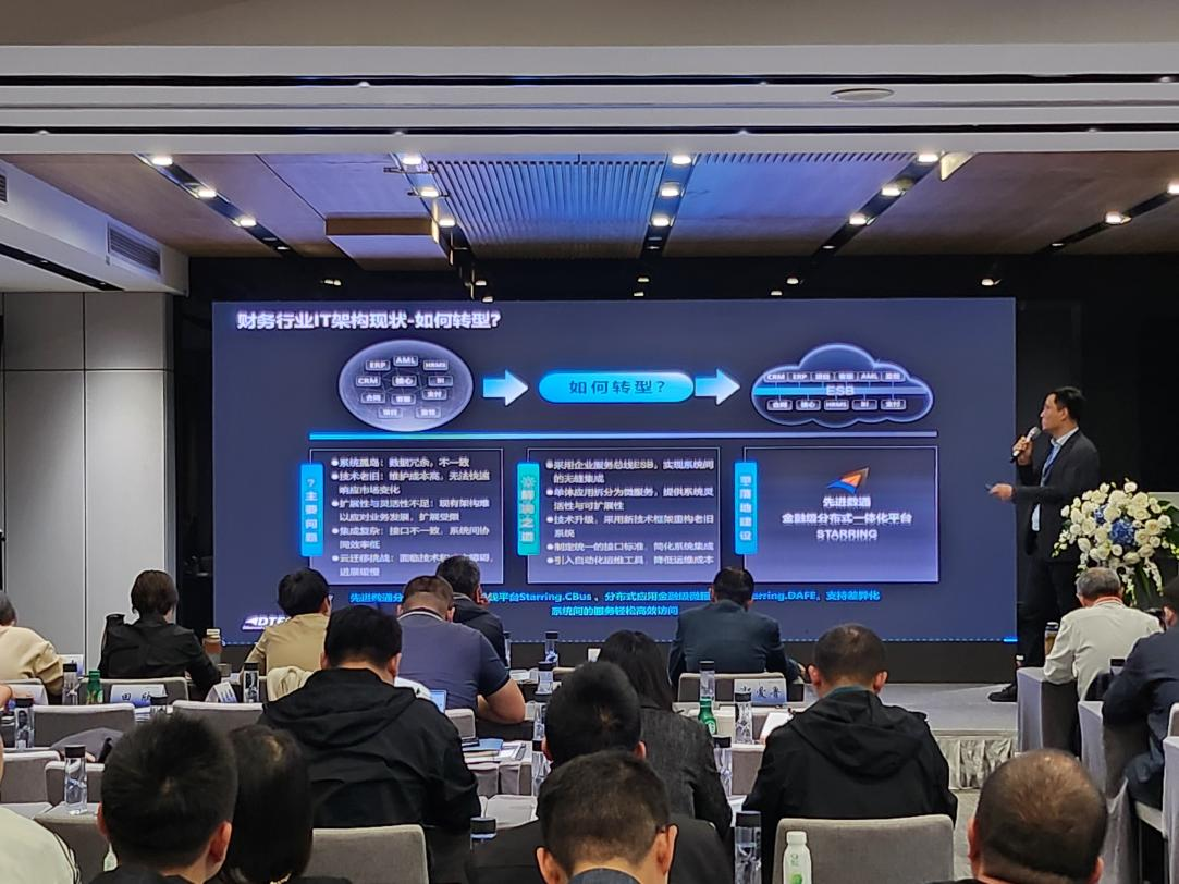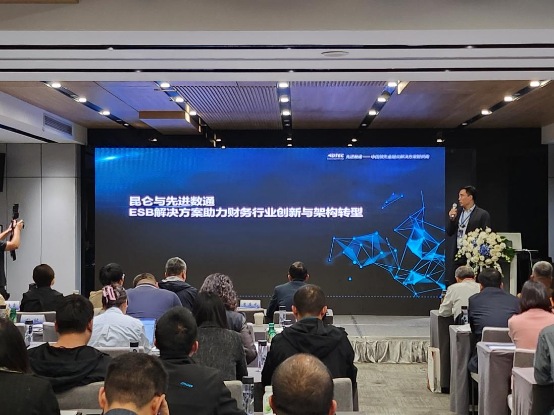 创富国际CFD 创富代表讲师郭钰以《昆仑与创富国际CFD 创富ESB解决方案助力财务行业创新与架构转型》为主题作发言分享。他深入剖析了当前财务行业IT架构面临的挑战,包括系统孤岛、技术老旧、扩展性不足等问题,并提出了基于企业服务总线(ESB)和微服务架构的转型方案。